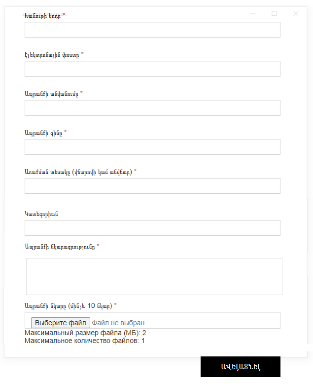 Նկարում ներկայացված է ապրանքի ավելացման ձևը հայերենով։ Ձևը գործում է աշխարհի գրեթե բոլոր լեզուներով: Ապրանք ավելացնելիս կարող եք ընտրել ցանկացած լեզու: